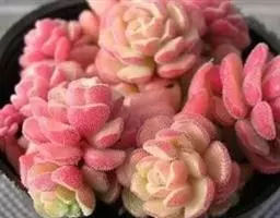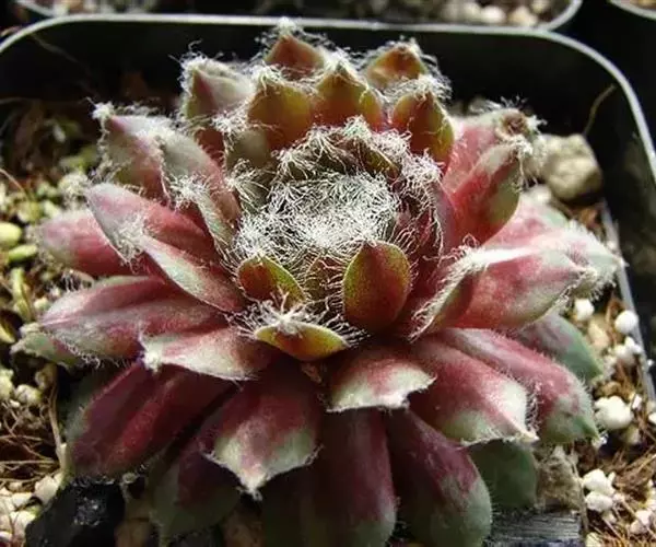 植株莲座形,莲座叶盘很小,但易群生呈垫状生长,因此在原产地每株占地面积较大。叶排列紧密,绿色中带红色,叶尖有白毛,在植株顶部联结如蛛网。叶元柄,倒卵形;粉红花,直径2厘米左右。
