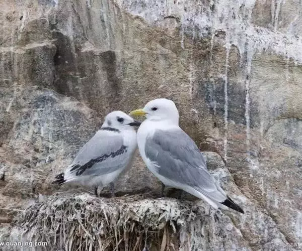 三趾鸥(学名:Rissa tridactyla),中型水鸟,体长38-47厘米。夏羽头、颈和翕前部白色。背、翅上覆羽和腰灰色。肩灰色,羽缘和尖端白色。尾上覆羽和尾白色。冬羽和夏羽基本相似,但头顶和枕淡灰色,头顶有不明显的灰色纵纹。后颈和翕前部灰色,带有暗色羽尖。常成群活动。主要以小鱼为食。有时也吃甲壳类和软体动物。觅食主要在海面涡流中捕食。也可在飞翔中或是游泳觅食。营巢于海岸和海岛上。常成群在一起繁殖。繁殖群从几对到数百对,通常营巢于岛屿或岸边悬岩和岩石上。营巢位置较为固定,老鸟常常回到同一地方营巢。雌雄共同营巢。巢主要由枯草、枯枝构成,内垫有羽毛。