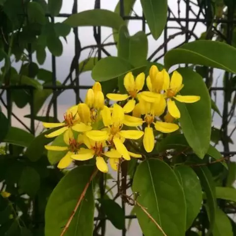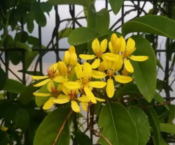木质藤木,长达10米。叶对生,纸质或亚革质,卵形,长6—12厘米,宽4—7厘米,先端急尖至渐尖,基部 圆形至心形,与叶柄交界处有2腺体,全缘,略反褶但不具腺体,无毛;叶柄长1—1.5厘米;托叶线形至披针形,长约1毫米,急尖。总状花序顶生或腋生;花梗长1.5—3厘米,中部以下具关节;花鲜黄色,直径2—2.5厘米;萼片三角形,长3毫米,宽1.5毫米;花瓣椭圆形,长8—13毫米,宽5—6毫米,爪长2—3毫米;雄蕊长3—4毫米。星芒状翅果直径1—2厘米。花期8月,果期10月。