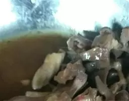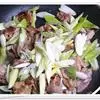 4. 待肉片变色后,放入葱块、精盐、味精、米醋(醋忌与羊肉一同食用!)、酱油拌炒
