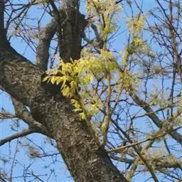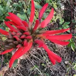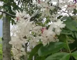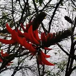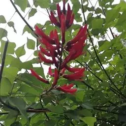龙牙花(学名:Erythrina corallodendron L.):是一种灌木或落叶小乔木植物,高约3-15米,树冠阔度可达3.5米。树皮粗糙,灰褐色;树干及枝条疏生粗壮的黑色瘤状皮刺,老枝无刺。叶为三出羽状复叶,互生;叶柄无毛,淡红色,有时上和下面中脉上疏生倒钩状小皮刺,长约6-12厘米;顶生小叶较侧生小叶为大,侧生小叶基部略偏斜;小叶菱状卵形或菱形,顶端尾状或渐尖而钝,基部宽楔形或近截形或近圆形,基部有一对腺体,全缘,两面无毛,有时背面的中脉上具小皮刺,长约4-10厘米,宽约2.5-8厘米;小叶柄无毛及中脉上有刺,长约3-5毫米;小托叶腺体状。