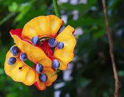 荚果长约10厘米,具梗,先端有喙,在种子间收缢;种子多颗,深红色,有一黑斑。花期6-11月。
