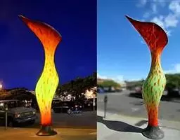 其叶柄高大粗壮,高可达2m左右,有大量形状不一的疣凸,表面绿色带不规则白色斑块。花期4至5月,花大而奇特,突露地面,呈倒立的古钟状,外被佛焰苞,较为宽大,高约30cm,口部直径约40cm,外面上部紫色,下部绿色,饰以白色斑纹,内面深紫色。肉穗花序深深地躲藏在这苞片里,呈现于人们面前的只有顶部圆锥状青紫色的附属器。