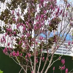 ‘紫嫣’玉兰(Magnolia soulangiana ‘ZiYan’)。二乔玉兰品种,落叶小乔木或灌木,株型紧凑,分枝密集。花桃红色,瓣顶色略浅,内面白色,盛开时花被片直立。花被片9,内外几同形。花期4月。果未见。