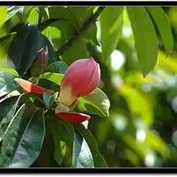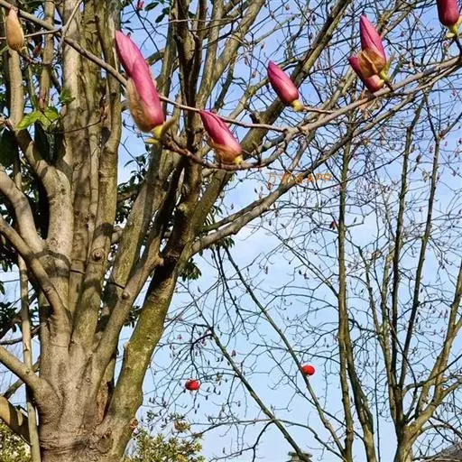 ‘红颜妒’玉兰(Magnolia ‘HongyanDu’)。红元宝玉兰(Magnolia soulangiana ‘HongYuanbao’)和玉灯玉兰的杂交品种。落叶小乔木,株型紧凑。花背面深红色,内里浅红色。花被片9-11片,外轮略小,有时大萼片状。花杯状,花被片直立,盛开时花被片外张,但不完全平展,有时略皱,花径15-18厘米。花期3月中下旬。果未见。