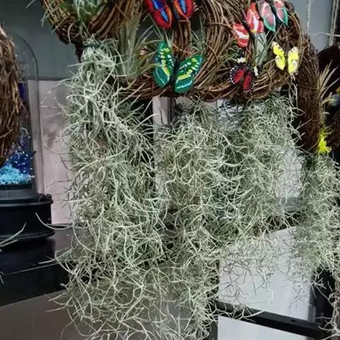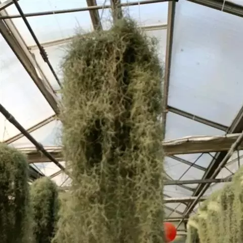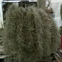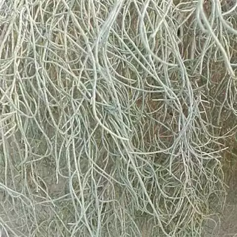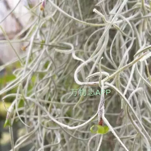 松萝铁兰也叫松萝凤梨,是凤梨科铁兰属,草本植物,植株下垂生长,茎长,纤细;叶片互生,半圆形,长3~4cm,密被银灰色鳞片;小花腋生,黄绿色,花萼紫色,小苞片褐色,花芳香。外形似地衣类的松萝。原产美国南部、阿根廷中部,中、南美洲广布。