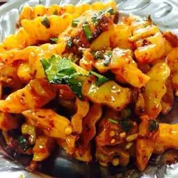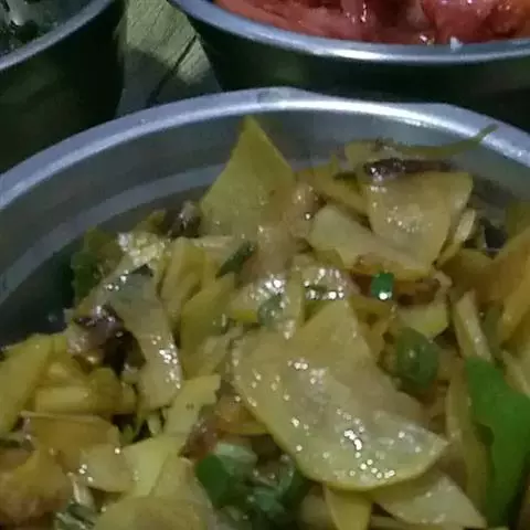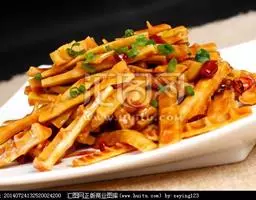 1、把上好土豆(红薯)去皮洗净切条儿,用色拉油炸熟后备用,上等冬笋(或煮熟的花菜也可)黄瓜切条备用,西芹切条,大葱 切段儿,生姜大蒜仔切片各少许即可,小葱切花放一边备用。