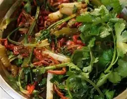 辅料:油2汤匙、生姜4片、郫县豆瓣酱1汤匙、小葱3根、干辣椒3个、大蒜3瓣、料酒2汤匙、白芝麻2克、香菜3根、白糖5克。
