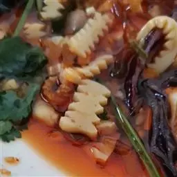 7、超市购买一代火锅底料,待吃完虾后投入锅中涮菜口味更浓!然后根据口味加入适量鸡精味精和骨头汤!