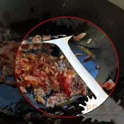 4、待炒上几番以后,配料差不多熟了,下虾酱,然后下少许味精、鸡精、(注:无须下盐,豆瓣里有含盐)继续翻炒。