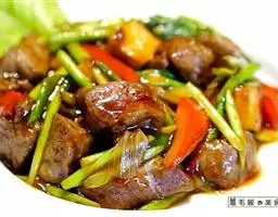 5、加入洋葱、尖椒、青蒜炒至断青。