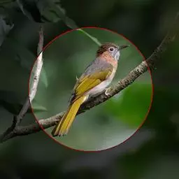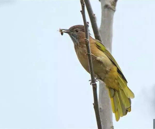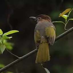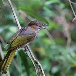 绿翅短脚鹎(学名:Hypsipetes mcclellandii):共有9个亚种。中型鸟类,体长20-26厘米。头顶羽毛形尖、栗褐色具白色羽轴纹,在暗色的头部极为醒目。上体灰褐缀橄榄绿色,两翅和尾亮橄榄绿色。耳和颈侧红棕色,颏、喉灰色,胸灰棕褐色具白色纵纹,尾下覆羽浅黄色。