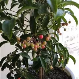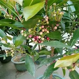 百两金1-2年生幼苗每年萌发2次新梢。春梢一般在3-4月萌发,秋梢一般在10-11月萌发。在新梢刚开始萌发不及1厘米长时,及时掐掉顶芽后,可促进侧芽的萌发生长,每次可萌发侧芽4-5枝,待第2次新梢萌发后,又及时掐掉上一轮侧枝的顶芽,可使幼苗的生长冠幅增大,植株高度可控制在30-40厘米;实生苗打芽去顶后,3年生苗已开始萌发花芽结果。连续去顶打芽、施肥和激素等处理是否能培育出优质的矮化盆栽商品,还有待于进一步研究。