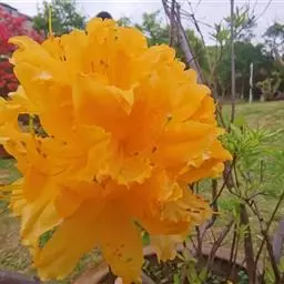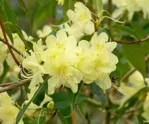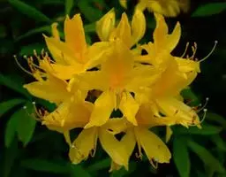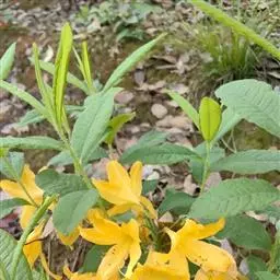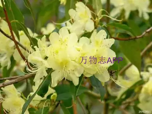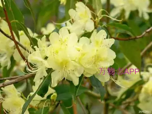 黄花杜鹃(学名:Rhododendron lutescens Franch.):灌木,高1-3米。幼枝细长,疏生鳞片。叶散生,叶片纸质,披针形、长圆状披针形或卵状披针形。花1-3朵顶生或生枝顶叶腋;宿存的花芽鳞覆瓦状排列;花萼不发育,波状5裂或环状;花冠宽漏斗状,略呈两侧对称,长2-2.5厘米,黄色,5裂至中部,裂片长圆形;雄蕊不等长;子房5室,花柱细长,洁净。蒴果圆柱形。花期3-4月。