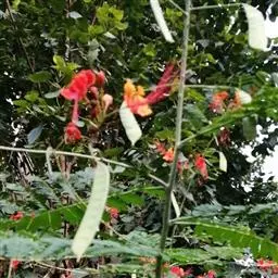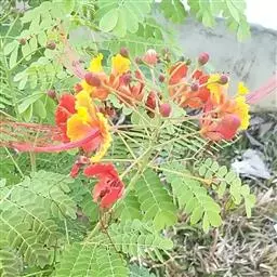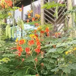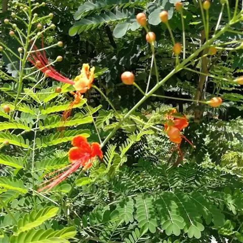洋金凤 Sw.),豆科小凤花属灌木状或小乔木植物,枝无毛,绿或粉绿色;二回羽状复叶;总状花序伞房状,…