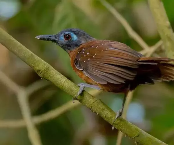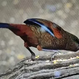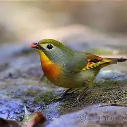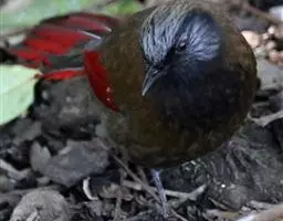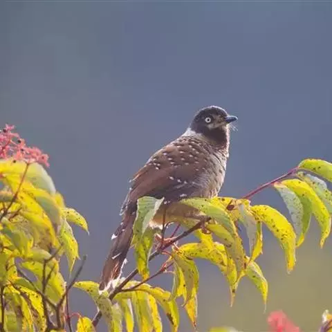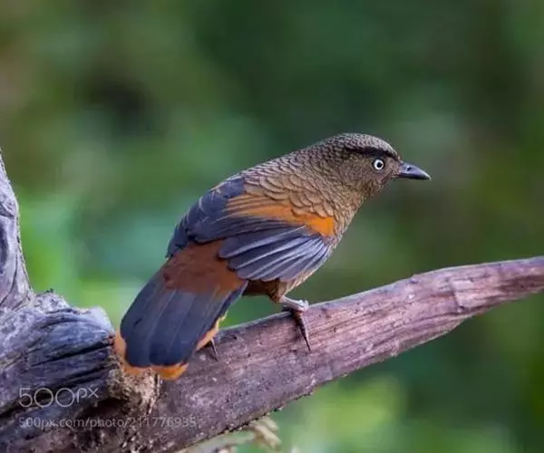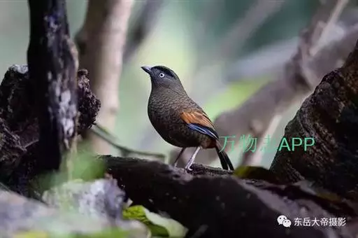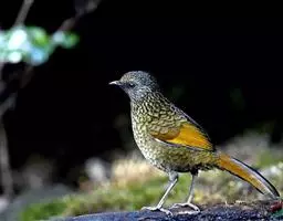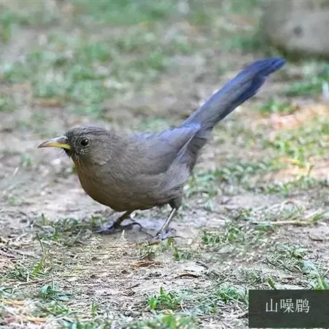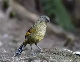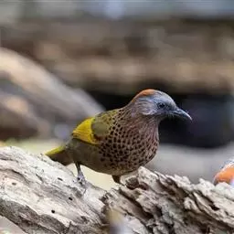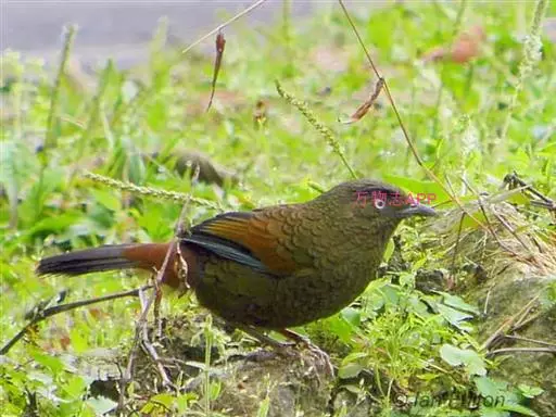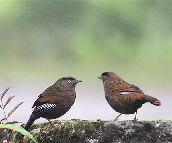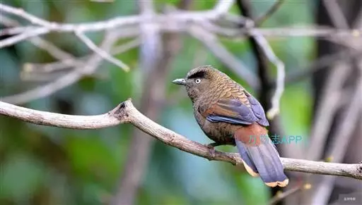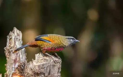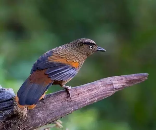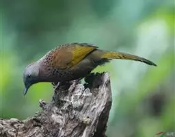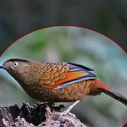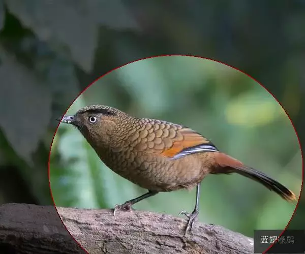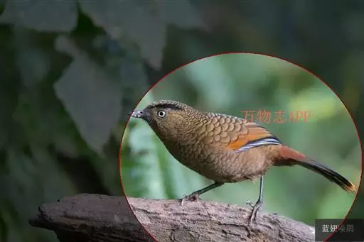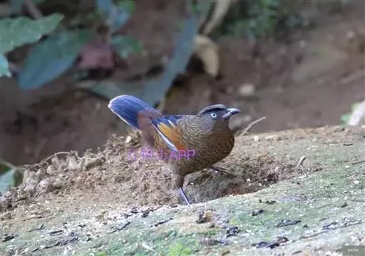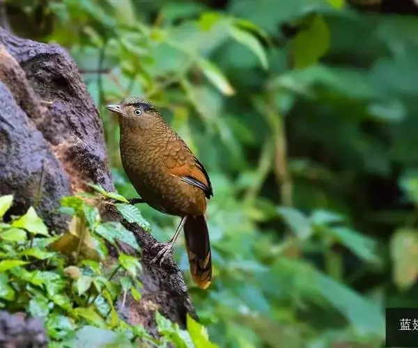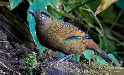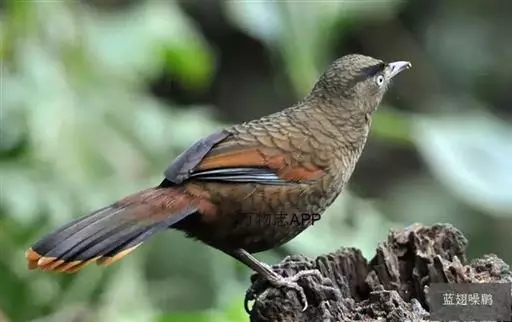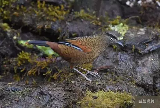 蓝翅噪鹛(学名:Garrulax squamatus):中型鸟类,体长22-25厘米。上体棕橄榄褐色密被黑色鳞状斑,眼蓝白色,眼上有一长而宽阔的黑色眉纹,从眼先直到颈侧。下体棕褐色被黑色鳞状斑;尾上和尾上覆羽栗色,尾黑色具棕色端斑;翅上覆羽栗色,初级覆羽灰黑色;飞羽黑褐色,外侧飞羽外翈蓝色,内侧飞羽基部亮栗色。