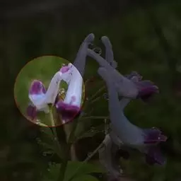 总状花序疏具3-10花。苞片狭卵圆形至披针形,渐尖,全缘,有时下部的疏具齿,约与花梗等长或稍长。花梗长约5毫米。萼片小,近圆形,直径约1.5毫米,具齿。花粉红色至紫红色,平展。外花瓣较宽展,顶端微凹,无鸡冠状突起。上花瓣长1.5-2厘米;距圆筒形,基部稍下弯,约占花瓣全长的1/3;蜜腺体长,近伸达距末端,大部分与距贴生,末端不变狭。下花瓣近基部渐狭。内花瓣具鸡冠状突起;爪纤细,稍长于瓣片。柱头横向纺锤形,两端各具1乳突,上面具沟槽,槽内具极细小的乳突。