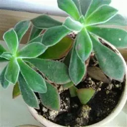 拍摄者:Emmanuelle Aubé 叶呈卵圆披针状,叶端收尖稍向内凹,被白粉,一般浅灰绿或浅灰蓝;光照充足、温差大时变为较鲜艳的紫粉色(通常在深秋或冬季时颜色最为鲜艳)。叶片较多,排列呈致密的莲座状,直径可达20。多年生植株密集群生,高10-12厘米,每个莲座直径可达15-20厘米。花期为春季,穗状花序,钟形花,先端五裂;花瓣内侧黄色,外侧粉色。