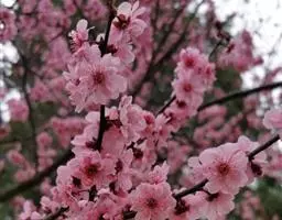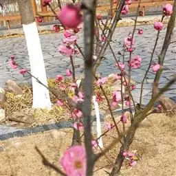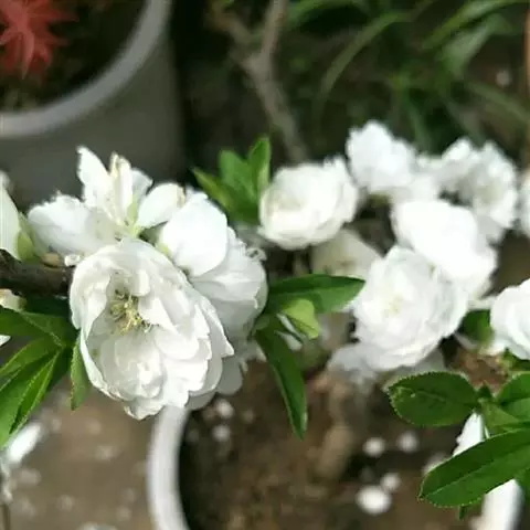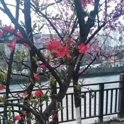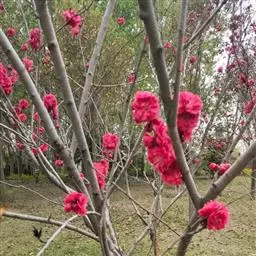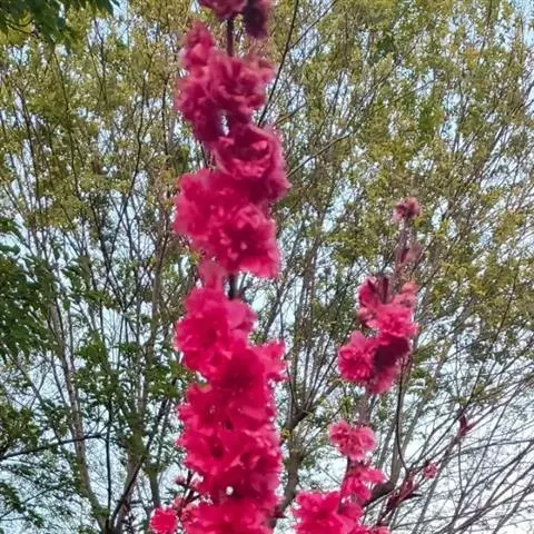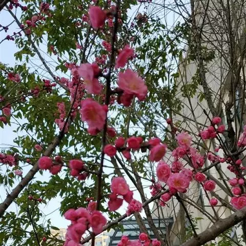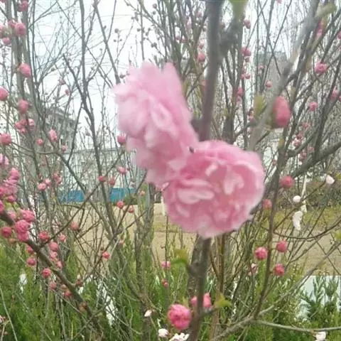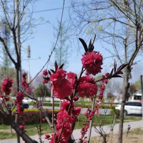 属于观赏桃花类的半重瓣及重瓣品种,统称为碧桃。华东地区碧桃花期是3月~4月,花朵丰腴,色彩鲜艳丰富,花型多。常见的品种有红花绿叶碧桃、红花红叶碧桃,白红双色洒金碧桃等多个变种。碧桃具有很高的观赏价值,在小区、公园、街道随处可见的美丽植物。