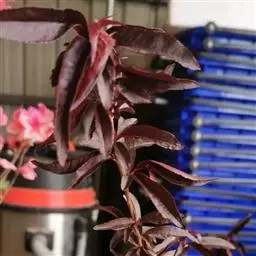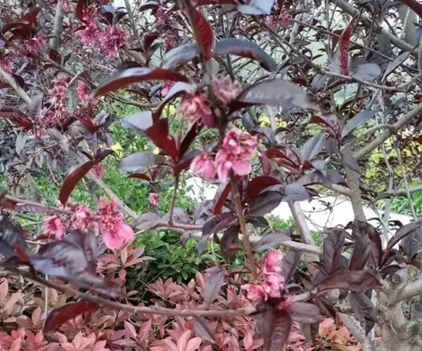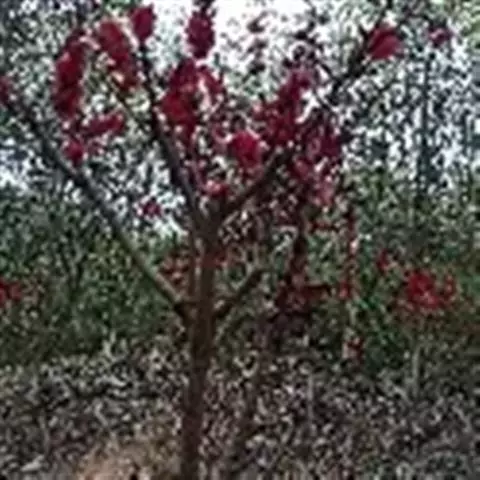 紫叶桃花(学名:Amygdalus persica L. var. persica f. atropurpu-rea Schneid.)是李亚科,桃属植物桃的变种,叶为窄椭圆形至披针形,长15厘米,宽4厘米,先端成长而细的尖端,边缘有细齿,暗绿色有光泽,叶基具有蜜腺;树皮暗灰色,随年龄增长出现裂缝;花单生,从淡至深粉红或红色,有时为白色,有短柄,直径4厘米,早春开花;近球形核果,表面有毛茸,肉质可食,为橙黄色泛红色,直径7.5厘米,有带深麻点和沟纹的核,内含白色种子。