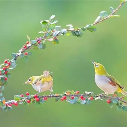 天的绣眼鸟,尤其是进入繁殖期的雄鸟,鸣唱非常频繁,而且其叫声婉转悦耳.清晨一打开笼罩,便马上会听到鸟儿的鸣唱,那是表示希望有只未配对的雌鸟能同它组成一对,建立一个家庭[这也是求爱的一种表现]..尤其是旁边在有只雄鸟[竞争对手]的话,两只鸟相互不甘示弱,啭鸣会进入高潮.用这种方法调教绣眼鸟鸣唱,是最能发挥出绣眼鸟的鸣唱水平的 .