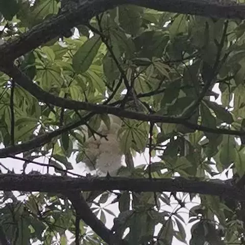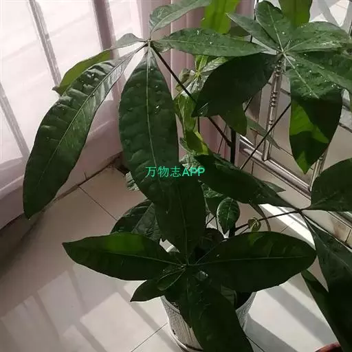 瓜栗(学名:Pachira macrocarpa (Cham. et Schlecht.) Walp. ),俗称发财树,木棉科小乔木,高4-5米,树冠较松散,幼枝栗褐色,无毛。小叶具短柄或近无柄。花单生枝顶叶腋;花梗粗壮,被黄色星状茸毛,脱落;萼杯状,近革质;花瓣淡黄绿色,狭披针形至线形,上半部反卷;雄蕊管较短,花丝连雄蕊管长13-15厘米,下部黄色,向上变红色,花药狭线形,弧曲;花柱长于雄蕊,深红色。蒴果近梨形,果皮厚,木质,几黄褐色,外面无毛,内面密被长绵毛,开裂,每室种子多数。种子大,不规则的梯状楔形,表皮暗褐色,有白色螺纹,内含多胚。花期5-11月,果先后成熟,种子落地后自然萌发。