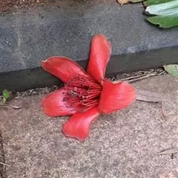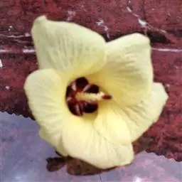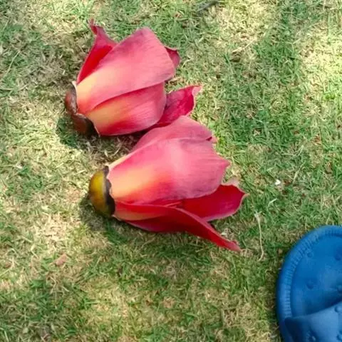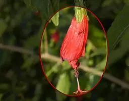 花单生枝顶叶腋;花梗粗壮,长2厘米,被黄色星状茸毛,脱落;萼杯状,近革质,高1.5厘米,直径1.3厘米,疏被星状柔毛,内面无毛,截平或具3-6枚不明显的浅齿,宿存,基部有2-3枚圆形腺体;花瓣淡黄绿色,狭披针形至线形,长达15厘米,上半部反卷;雄蕊管较短,分裂为多数雄蕊束,每束再分裂为7-10枚细长的花丝,花丝连雄蕊管长13-15厘米,下部黄色,向上变红色,花药狭线形,弧曲,长2-3毫米,横生;花柱长于雄蕊,深红色,柱头小,5浅裂。