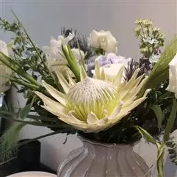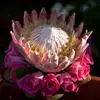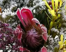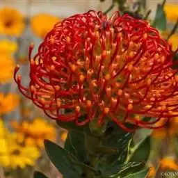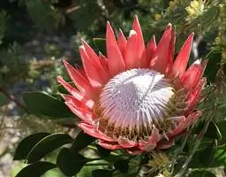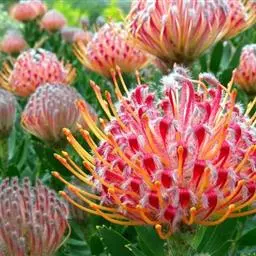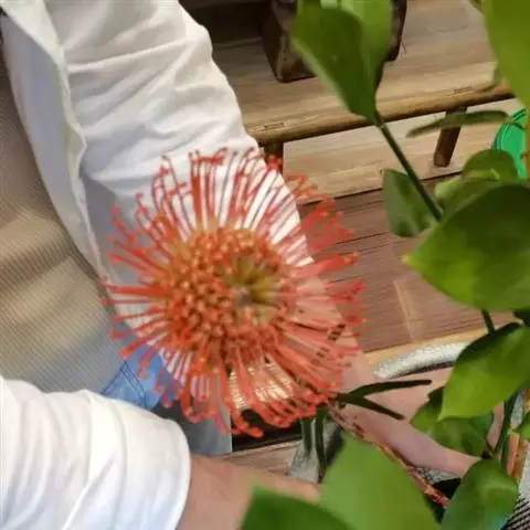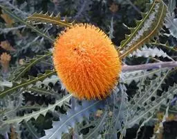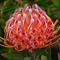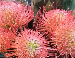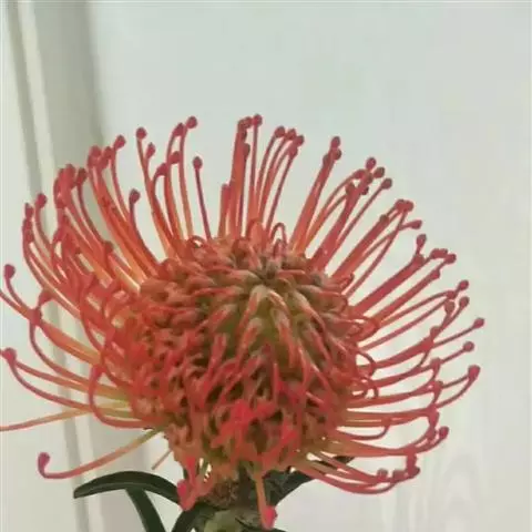 帝王花,山龙眼科帝王花属多年生常绿灌木植;茎干粗壮,叶色翠绿光亮;花朵呈圆球状;其苞片有的完全打开,…