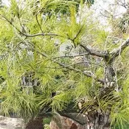 金叶大阪松以“锦锦”为上品,其叶较短粗,金色显著及叶之一半,枝密,生长缓慢,因而能自然成片;“宫岛”叶稍长,入秋渐现金色,仅及叶的三分之一左右,枝叶松散,次于“锦锦”。