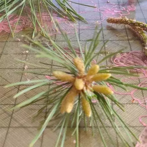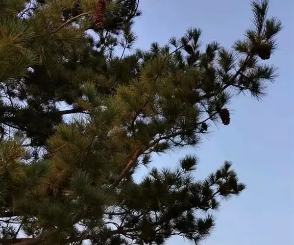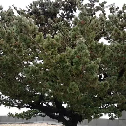 五针松树皮灰褐色,老干有不规则鳞片状剥裂,内皮赤褐色,一年生小枝淡褐色,密生淡黄色柔毛,冬芽长椭圆形,黄褐色;叶短,五针一束;内侧两面有白色气孔线,花期5月,球花单性同株,雄球花聚生新枝下部,雌球花聚生新枝端部。球果卵圆形,翌年10~11月种子成熟,种子为倒卵形,具三角形种翅,淡褐色。