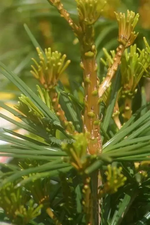 黄叶五针松var.variegata,叶全部黄色或生黄斑。