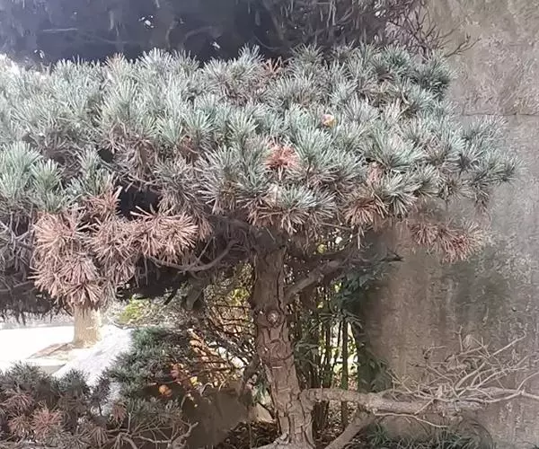 银叶大阪松中的“姬箫”,叶细短,密集梢端,生长亦缓,姿态优美;“霜降”则叶芽白似霜,日名“三代将军”。其它如旋叶、折叶、白头等变种偶有所见,但不普及。