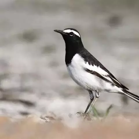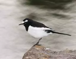 日本鹡鸰:体长约20厘米。上体多黑色,额、颏及眉纹白,下体白,两翼黑而具白色横斑及羽缘,…
