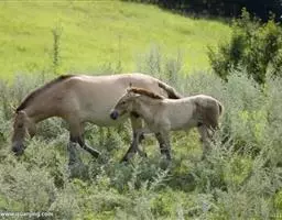 普氏野马:体长约210厘米,肩高约110厘米,尾长90厘米,体重350千克。头部长大,颈粗,耳比驴…