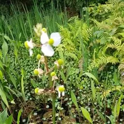 慈姑(学名:Sagittaria trifolia L. var. sinensis (Sims.) Makino )泽泻科多年生草本植物,生在水田里,叶子像箭头,开白花。地下有球茎,黄白色或青白色,以球茎作蔬菜食用。可以吃。也作茨菰。本变种与原变种不同在于:植株高大,粗壮;叶片宽大,肥厚,顶裂片先端钝圆,卵形至宽卵形;匍匐茎末端膨大呈球茎,球茎卵圆形或球形,可达5-8×4-6厘米;圆锥花序高大,长20-60厘米,有时可达80厘米以上,着生于下部,具1-2轮雌花,主轴雌花3-4轮,位于侧枝之上;雄花多轮,生于上部,组成大型圆锥花序,果期常斜卧水中;果期花托扁球形,直径4-5毫米,高约3毫米。种子褐色,具小凸起。