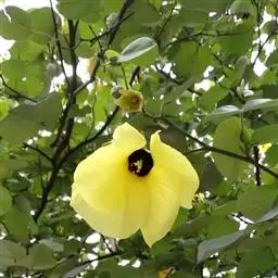 樟叶槿(Hibiscus grewiifolius Hassk)为锦葵科木槿属植物。常绿小乔木,高可达7 m。叶纸质至近革质,卵状长圆形至椭圆状长圆形,先端短急尖,基部钝至阔楔形,两面均平滑无毛,上面暗绿色,下面苍绿色。花硕大,黄色,全年不定时开花。果单生于上部叶腋间。