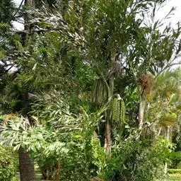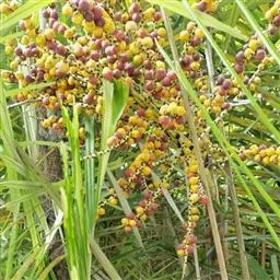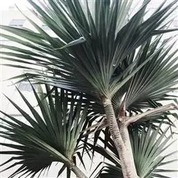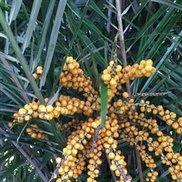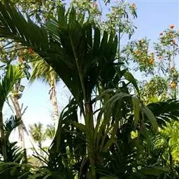 2.夏威夷椰子(Pritchardia gaudichaudiiH. wendl):棕榈科茶马椰子属,茎干直立,株高1-3米。茎节短,中空, 从地下匍匐茎发新芽而抽长新枝,呈丛生状生长,不分枝。叶多着生茎干中上部,为羽状全裂,裂片披针形,互生,叶深绿色,且有光泽。花为肉穗花序,腋生于茎 干中上部节位上,粉红色。浆果紫红色。开花挂果期可长达2-3个月。