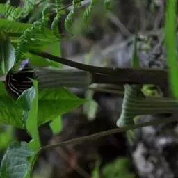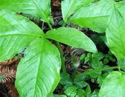 螃蟹七又名紫盔天南星、城口天南星。多年生草本。块茎扁球形,直径3-5cm,常具多数小球茎。鳞叶3,褐色,宽2-2.5cm,向上渐狭,最上的长约15cm。叶柄长20-40cm,粗6-7mm,下部1/4具鞘;叶片3深裂至3全裂,裂片全缘,中裂片近菱形,卵状长圆形至卵形,长17-32cm,宽15-25cm;侧裂片斜椭圆形,长9-23cm,宽6-16cm;中肋背面隆起,侧脉9-10对,集合脉距边缘约5mm。花序柄比叶柄短而细,长18-26cm。佛焰苞紫色,有苍白色线状条纹,管部近圆柱形,长4-8cm,直径1.5-2cm,喉部边缘耳状反卷;檐部长圆三角形,拱形下弯或近直立,长6-12cm,宽4-4.5cm,长渐尖,具长1-4cm的尾尖。肉穗花序单性,雄花序长2.5-3cm,圆柱形,粗4-5mm,雄花有花药2-4,药室卵圆形,基部叉开,顶孔开裂;雌花序长约2cm,子房具棱,顶部常圆形,花柱极短而粗,柱头有毛;附属器粗壮,圆锥状,长约4.5-9cm,基部骤狭成短柄,上部长渐尖,先端钝,粗1.5-5mm,近直立或上部略弯。花期5-6月。