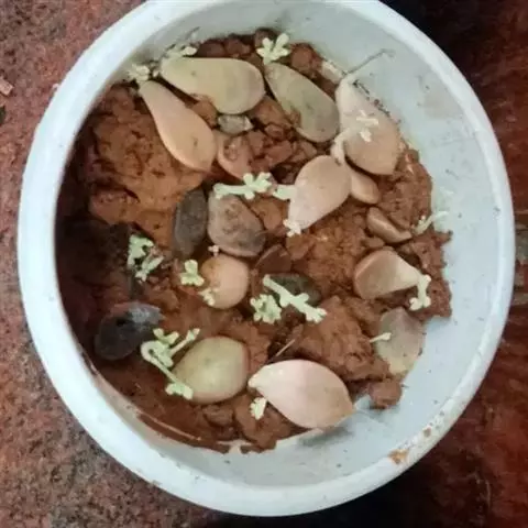2.将芹菜洗净,切成1cm长的段。芝麻炒熟和熟花生一起压成末备用。