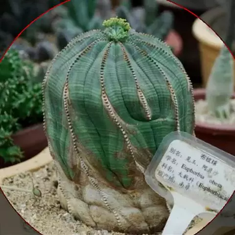 魁伟玉原产南非,是一种大戟科的多年生肉质植物,植株具粗圆筒形肉质茎,有10条以上的突出棱,…