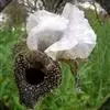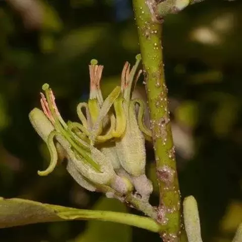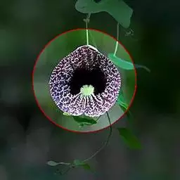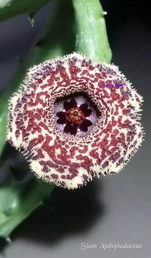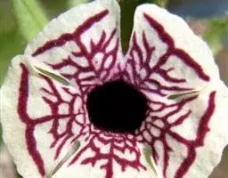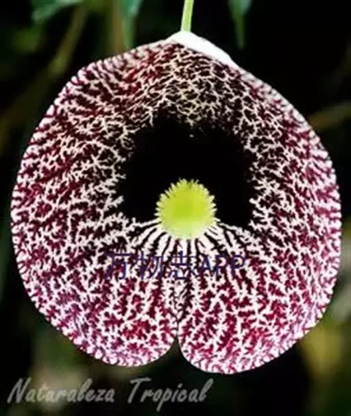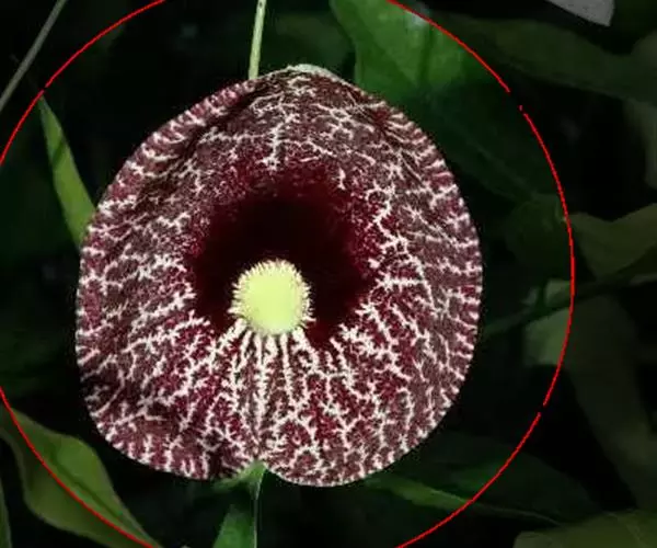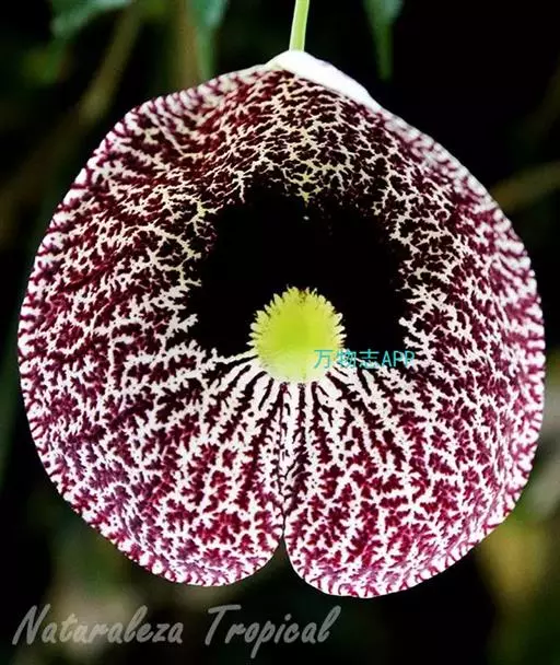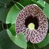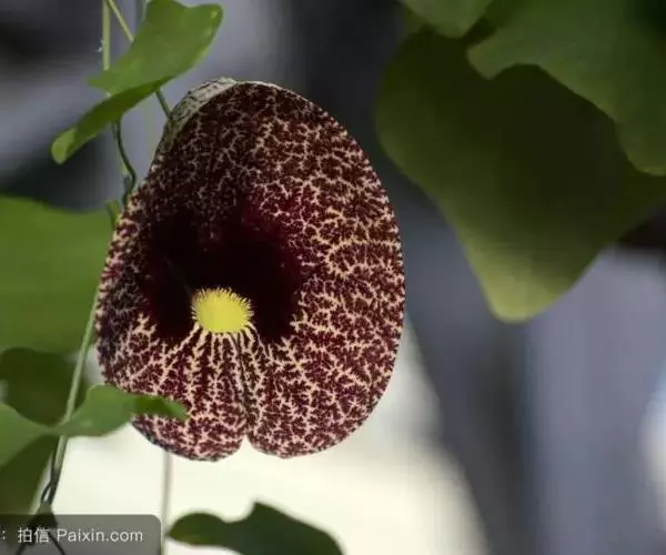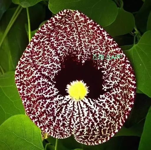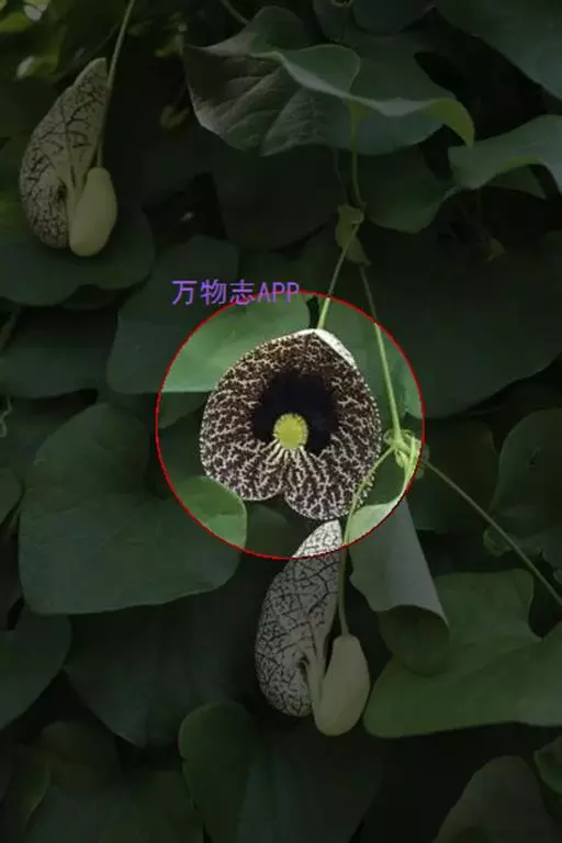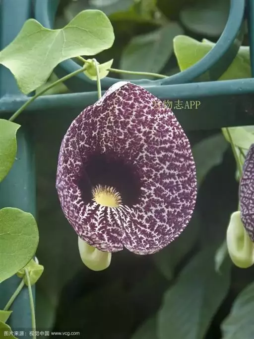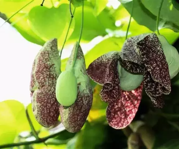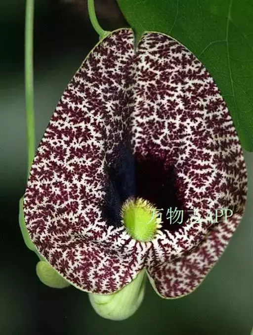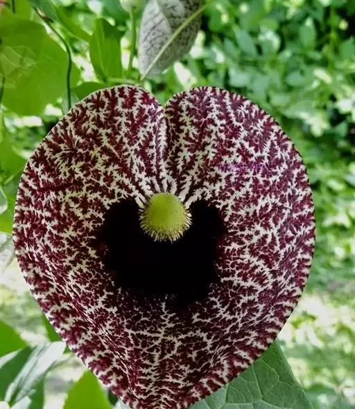 美丽马兜铃开花照 花单生于叶腋,花柄下垂长10~12厘米,先端着一花;花被合生,向上弯曲,呈喇叭状;未开放前为一气囊,形似饺子,长10厘米,宽4厘米,有紫褐色脉纹,花被筒基部膨大,中部细,上部扩大成喇叭形,黄绿色;全朵自下而上呈“S”形弯曲,造型奇特,十分别致。开花时沿中缝裂开,呈长椭圆形,内满布深紫色斑点,喇叭口处有一半月形紫色斑块,很是显眼。子房下位,蒴果长圆柱形,成熟时黑褐色,6个心皮由花柄处裂开,将花柄一分为二,呈吊篮状悬挂在空中,甚是好看。种子深褐色,呈等腰三角形,有膜翅。开花时发出浓烈臭味,引得蚂蚁等昆虫前来为其授粉。花期5~9月,果期6~10月。