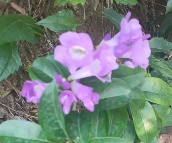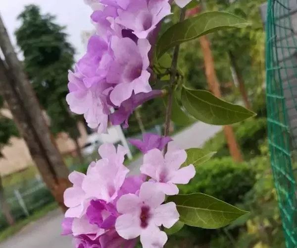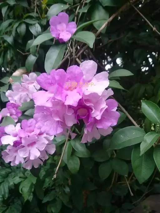蒜香藤花朵 蒜香藤为常绿攀缘性植物。三出复叶对生,小叶椭圆形,顶小叶常呈卷须状或脱落,小叶约7-10厘米长,3-5厘米宽,全圆锥花序腋生;花冠筒状,花瓣前端5裂,紫色。