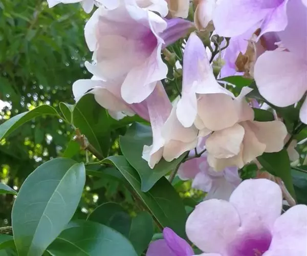 蒜香藤(拉丁学名:Mansoa alliacea (Lam.)A.H.Gentry),又名紫铃藤、张氏紫葳,为紫葳科常绿藤状灌木。植株蔓性,具卷须,叶为二出复叶,深绿色椭圆形,具光泽。花腋生,聚伞花序,花冠筒状,开口五裂。花期春季至秋季,盛花期8-12月。其花、叶在搓揉之后,有大蒜的气味,因此得名蒜香藤。 [1-2]
