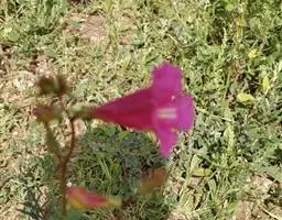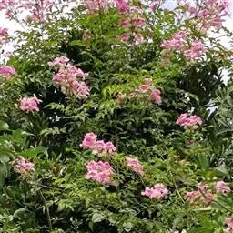 粉花凌霄 K.Schum.)是紫葳科魔盒凌霄属的落叶藤本植物。奇数羽状复叶对生,小叶全缘,…