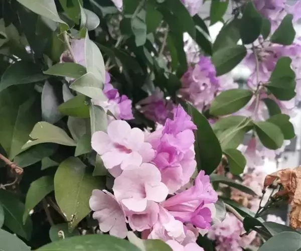 蒜香藤花期为春至秋季,一般在夏末初秋的9-10月开花最旺。春秋开花,花朵初开时,颜色较深,以后颜色渐淡,每朵花约可维持5-7天。花紫红色至白色,,叶揉搓有蒜香味。