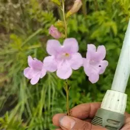 蒜香藤 春、夏、秋季均为扦插适期,尤以3-7月为佳。扦插时剪取成熟枝条,每段插穗长约15厘米左右,剪去插穗下部1/3叶片,插穗下部的切口应靠近节的下部。介质采用珍珠岩或河沙均可。扦插深度以枝干不倒为好,密度以不挤不碰为宜,保证根部透气和叶片通风及良好光照。按常规管理约3-4周可生根,生根率可达85%以上。扦插苗生根并长出新叶后,可结合喷水施0.5%-1.0%尿素,促进扦插苗生长。约7周待根系发育完全即可进行移植。