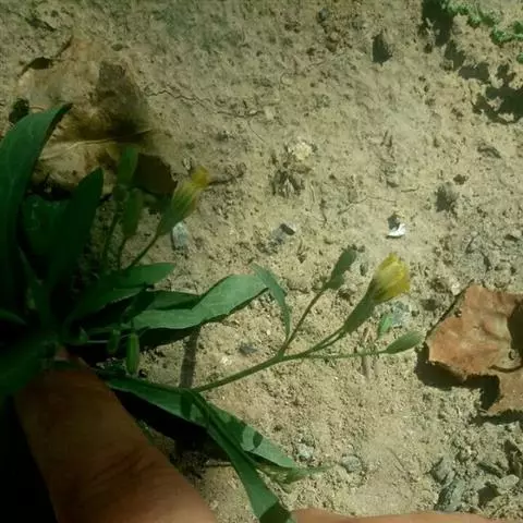 一年生草本。根垂直直伸,生多数须根。茎直立,高10-80厘米,基部直径2-4毫米,上部伞房花序状分枝,或自基部多分枝或少分枝,分枝弯曲斜升,全部茎枝无毛。基生叶花期生存,线形或线状披针形,包括叶柄长7-12厘米,宽5-8毫米,顶端急尖,基部渐狭成长或短柄;中下部茎叶披针形或线形,长5-15厘米,宽1.5-2厘米,顶端急尖,基部箭头状半抱茎,向上或最上部的叶渐小,与中下部茎叶同形,基部箭头状半抱茎或长椭圆形,基部收窄,但不成箭头状半抱茎;全部叶两面无毛,边缘全缘,极少下部边缘有稀疏的小尖头。