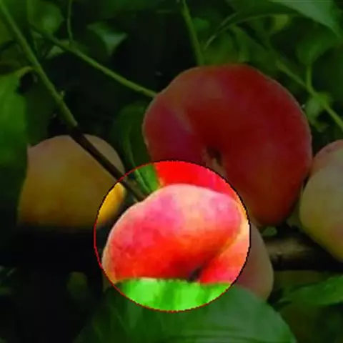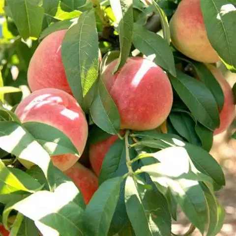 乔木,高3-8米;树冠宽广而平展;树皮暗红褐色,老时粗糙呈鳞片状;小枝细长,无毛,有光泽,绿色,向阳处转变成红色,具大量小皮孔;冬芽圆锥形,顶端钝,外被短柔毛,常2-3个簇生,中间为叶芽,两侧为花芽。叶片长圆披针形、椭圆披针形或倒卵状披针形,长7-15厘米,宽2-3.5厘米,先端渐尖,基部宽楔形,上面无毛,下面在脉腋间具少数短柔毛或无毛,叶边具细锯齿或粗锯齿,齿端具腺体或无腺体;叶柄粗壮,长1-2厘米,常具1至数枚腺体,有时无腺体。花单生,先于叶开放,直径2.5-3.5厘米;花梗极短或几无梗;萼筒钟形,被短柔毛,稀几无毛,绿色而具红色斑点;萼片卵形至长圆形,顶端圆钝,外被短柔毛;花瓣长圆状椭圆形至宽倒卵形,粉红色,罕为白色;雄蕊约20-30,花药绯红色;花柱几与雄蕊等长或稍短;子房被短柔毛。果实形状和大小均有变异,卵形、宽椭圆形或扁圆形,直径(3)5-7(12)厘米,长几与宽相等,色泽变化由淡绿白色至橙黄色,常在向阳面具红晕,外面密被短柔毛,稀无毛,腹缝明显,果梗短而深入果洼;果肉白色、浅绿白色、黄色、橙黄色或红色,多汁有香味,甜或酸甜;核大,离核或粘核,椭圆形或近圆形,两侧扁平,顶端渐尖,表面具纵、横沟纹和孔穴;种仁味苦,稀味甜。花期3-4月,果实成熟期因品种而异,通常为8-9月。2n=16。