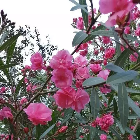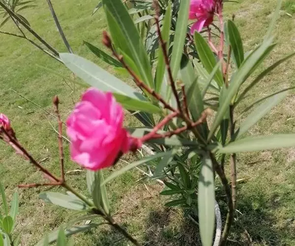 夹竹桃的叶片如柳似竹,红花灼灼,胜似桃花,花冠粉红至深红或白色,有特殊香气,花期为6-10月,是有名的观赏花卉。