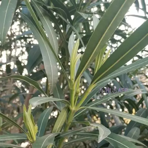 欧洲夹竹桃(Nerium oleander L.)直立常绿灌木,枝条灰绿色,含水液。叶轮生,稀对生,具柄,革质,羽状脉,侧脉密生而平行。伞房状聚伞花序顶生,具总花梗;花萼5裂,裂片披针形,双覆盖瓦状排列,内面基部具腺体;花冠漏斗状,红色、栽培有演变为白色或黄色,花冠筒圆筒形,上部扩大呈钟状,喉部具5枚阔鳞片状副花冠,每片顶端撕裂;花冠裂片5,或更多而呈重瓣,斜倒卵形,花蕾时向右覆盖;雄蕊5,着生在花冠筒中部以上,花丝短,花药箭头状,附着在柱头周围,基部具耳,顶端渐尖,药隔延长成丝状,被长柔毛;无花盘;子房由2枚离生心皮组成,花柱丝状或中部以上加厚,柱头近球状,基部膜质环状,顶端具尖头;每心皮有胚珠多颗。蓇葖2,离生,长圆形;种子长圆形,种皮被短柔毛,顶端具种毛。